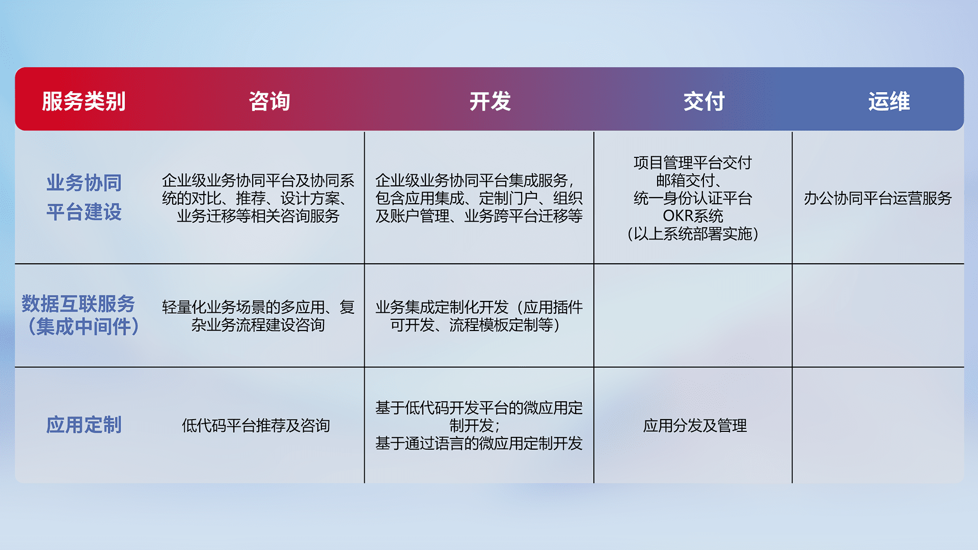 针对钉钉、、、企微、、IDaas等平台级产品提供产品的规划、、方案、、、、交付、、、定制化开发等服务,,实现如统一协同办公、、、、智能客户服务、、、混合会议管理、、智能数据查询、、、等业务场景,,实现数字化转型。。。